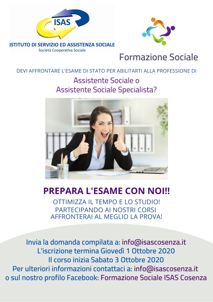 Scarica la domanda di iscrizione qui e inviala compilata a: info@isascosenza.it L’iscrizione termina sabato 20 marzo 2021 Per ulteriori informazioni contattaci a: info@isascosenza.it o sul nostro profilo Facebook: Formazione Sociale ISAS Cosenza