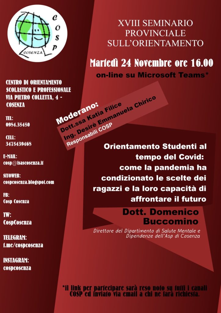 Per la prima volta il Seminario COSP si svolgerà interamente on-line, ma non perderà di valore e contenuto. A relazionare avremo il Dott. Domenico Buccomino, Direttore del Dipartimento di Salute Mentale e Dipendenze dell’ASP di Cosenza. Vi aspettiamo numerosi! Vi chiediamo di darci conferma attraverso la nostra email: cosp@isascosenza.it così da avere la possibilità di […]