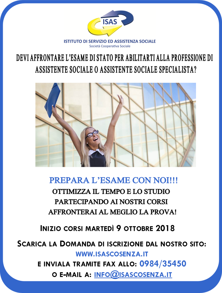 I corsi iniziano sabato 28 aprile 2018 Scarica qui la domanda di iscrizione e inviala tramite fax allo: 0984/35450 o e-mail a: info@isascosenza.it
